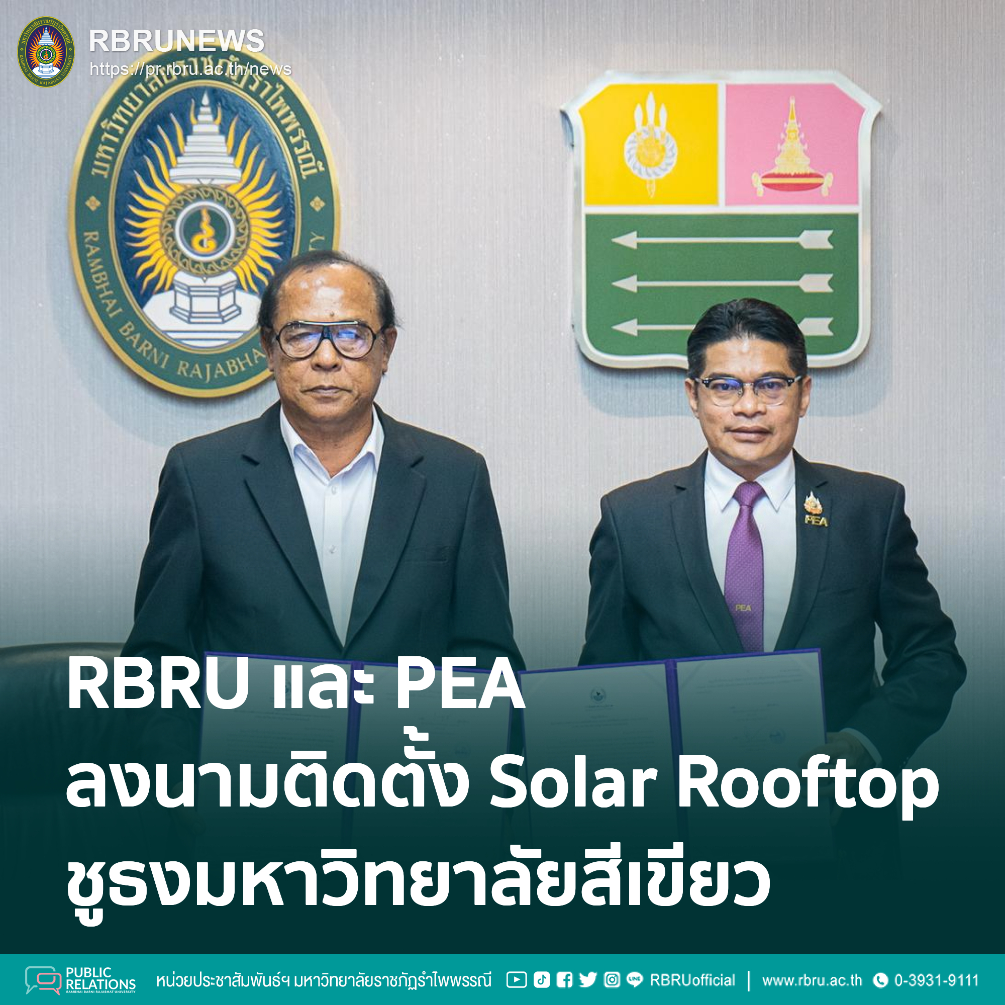 มหาวิทยาลัยราชภัฏรำไพพรรณี ร่วมกับ การไฟฟ้าส่วนภูมิภาค (PEA) ลงนามบันทึกข้อตกลงความร่วมมือ โครงการจัดการพลังงานไฟฟ้าจากระบบผลิตไฟฟ้าพลังงานแสงอาทิตย์บนหลังคา (Solar Rooftop) ภายในมหาวิทยาลัย ณ ห้องประชุมสามศร อาคารสำนักงานอธิการบดี