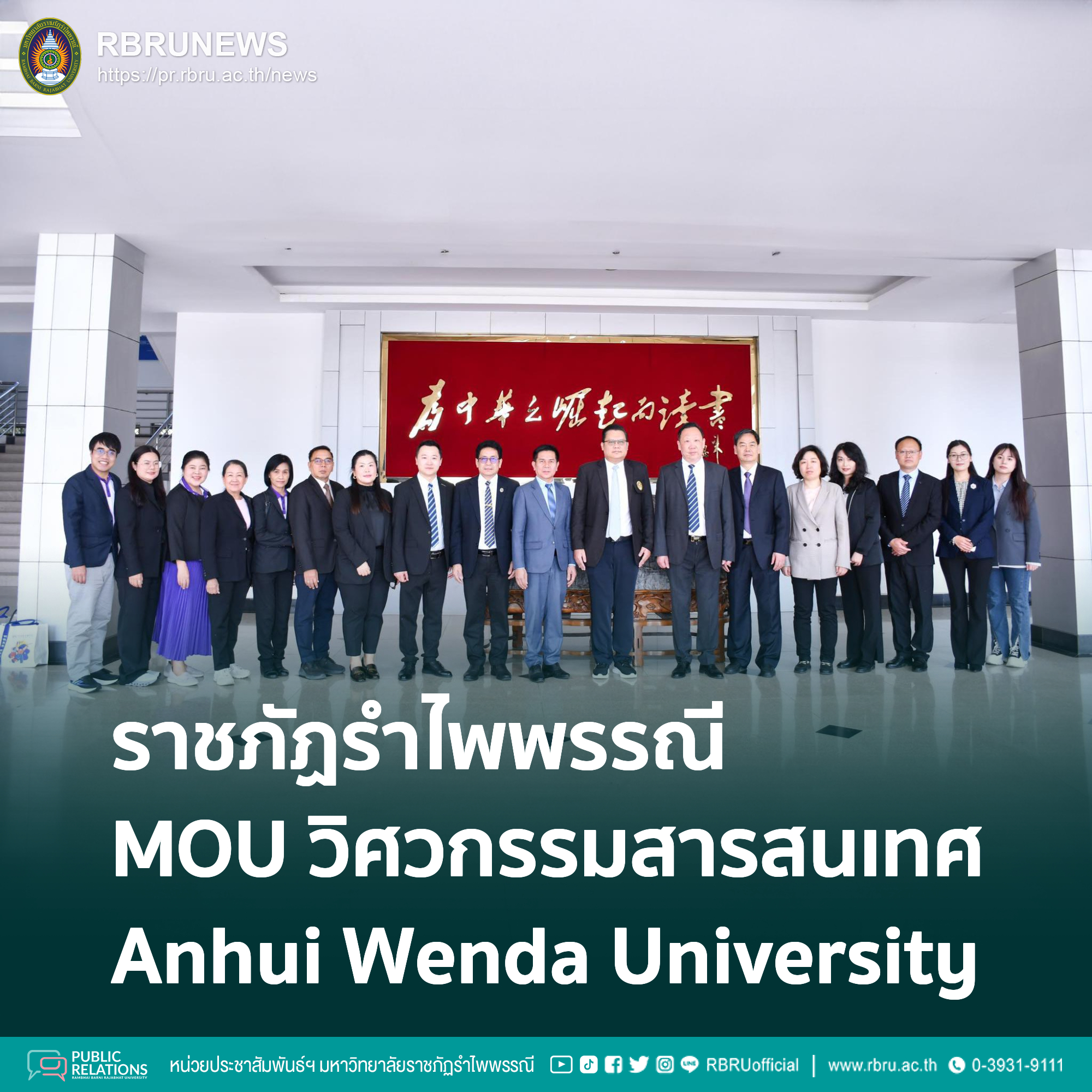 ที่เมืองเหอเฟย์ มณฑลอานฮุย สาธารณรัฐประชาชนจีน ท่านอธิการบดีมหาวิทยาลัยราชภัฏรำไพพรรณี ผศ.ไวกูณฑ์ ทองอร่าม ได้มอบอำนาจ ท่านรองอธิการบดีฝ่ายสภามหาวิทยาลัย ผศ.ดร.นักรบ เถียรอ่ำ ร่วมลงนามข้อตกลงทางวิชาการ (MOU) กับ ANHUI WENDA UNIVERSITY OF INFORMATION ENGINEERING โดยมีรองอธิการบดี ท่าน Hu Shanfeng และคณะผู้บริหารมหาวิทยาลัยร่วมเป็นพยานในการทำข้อตกลงในครั้งนี้ โดยการประสานความร่วมมือจาก Dr.Zhang Dejun Chinese Director of International Education Center