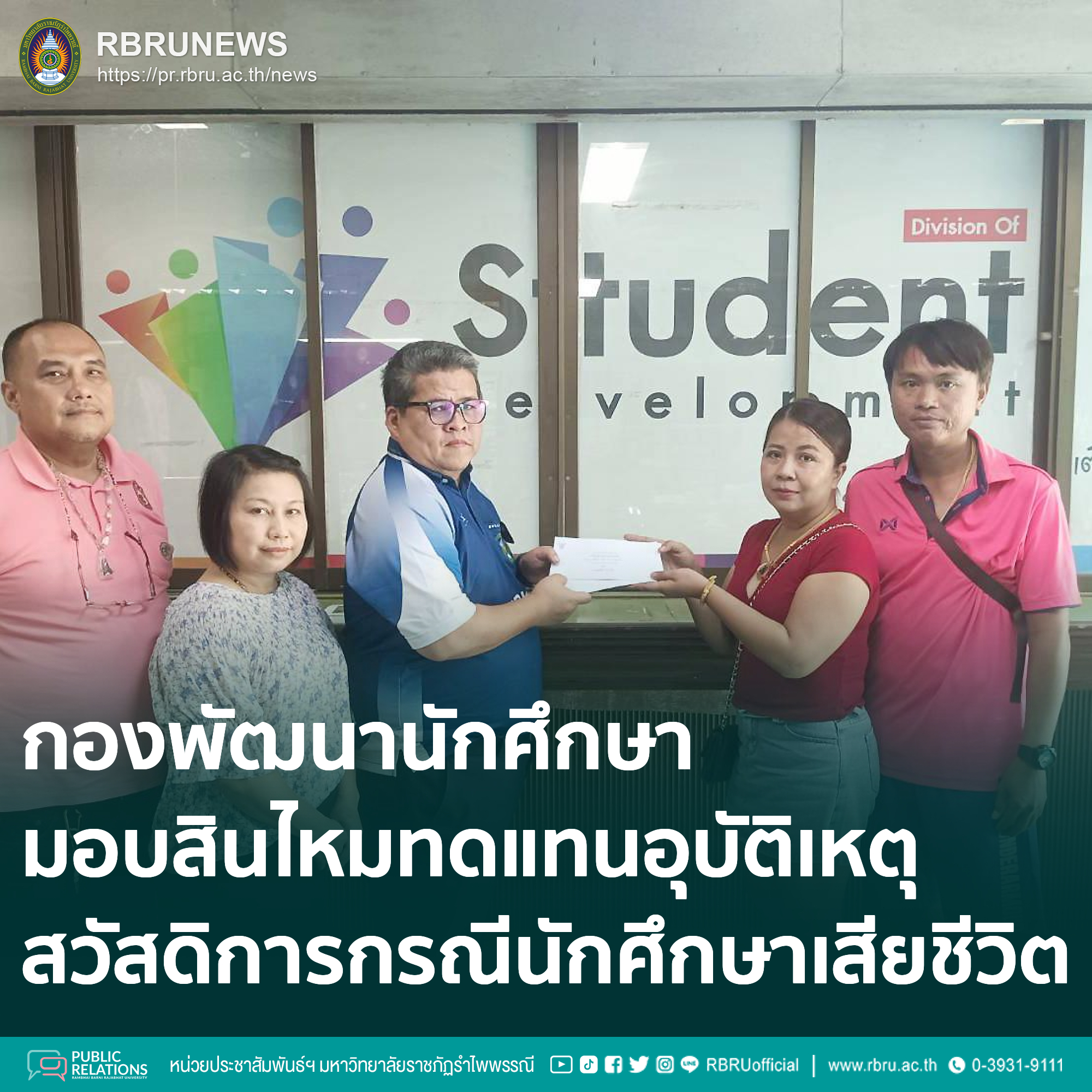 มหาวิทยาลัยราชภัฏรำไพพรรณี ตอกย้ำความมุ่งมั่นในการดูแลสวัสดิการนักศึกษาอย่างต่อเนื่อง ล่าสุด กองพัฒนานักศึกษาได้ดำเนินการมอบสินไหมทดแทนจำนวน 120,000 บาท ให้แก่ผู้ปกครองของนักศึกษาสาขาวิชาวิศวกรรมโยธา คณะเทคโนโลยีอุตสาหกรรม จากอุบัติเหตุทางถนน ซึ่งได้รับการคุ้มครองจากกรมธรรม์ประกันภัยนักศึกษาของเมืองไทยประกันภัย ถือเป็นอีกก้าวสำคัญในการสร้างหลักประกันความมั่นคงและเสริมสร้างคุณภาพชีวิตของนักศึกษาและครอบครัว