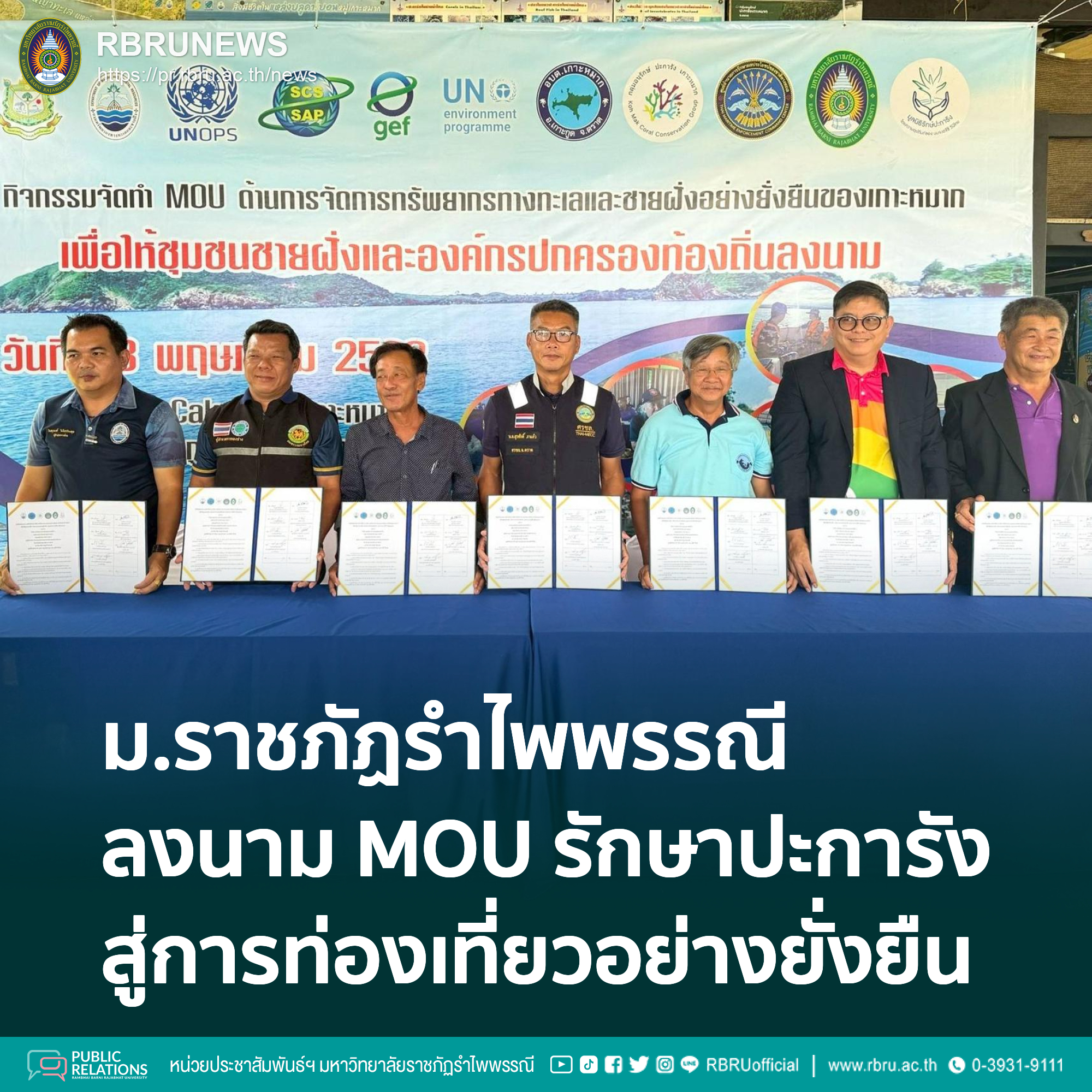 เมื่อวันที่ 13 พฤษภาคม 2568 ณ Sweet Cake ตำบลเกาะหมาก อำเภอเกาะกูด จังหวัดตราด ได้มีการจัดพิธีลงนามบันทึกข้อตกลงความร่วมมือด้านการจัดการทรัพยากรทางทะเลและชายฝั่งอย่างยั่งยืนของเกาะหมาก โดยมีผู้ช่วยศาสตราจารย์ ดร.วยากร อุดมโภชน์ รองอธิการบดี ด้านวางแผนและพัฒนา พร้อมด้วยผู้ช่วยศาสตราจารย์ สุทธินันท์ โสตวิถี ผู้อำนวยการสำนักบริการวิชาการ มหาวิทยาลัยราชภัฏรำไพพรรณี เป็นผู้แทนมหาวิทยาลัยฯ ร่วมลงนามกับภาคีเครือข่ายสำคัญ ได้แก่ สำนักงานทรัพยากรทางทะเลและชายฝั่งที่ 1 (โดย ว่าที่ ร.ต.วิษณุพงศ์ วิเชียรรัตนกุล ผู้อำนวยการส่วนอนุรักษ์ทรัพยากรทางทะเล เป็นผู้แทน), องค์การบริหารส่วนตำบลเกาะหมาก, กลุ่มอนุรักษ์ปะการังเกาะหมาก, ศูนย์อำนวยการรักษาผลประโยชน์ของชาติทางทะเลจังหวัดตราด, วิสาหกิจชุมชนท่องเที่ยวเกาะหมาก และมูลนิธิรักษ์ปะการัง โดยได้รับการสนับสนุนจาก บริษัท เอจีซี วีนิไทย จำกัด (มหาชน)