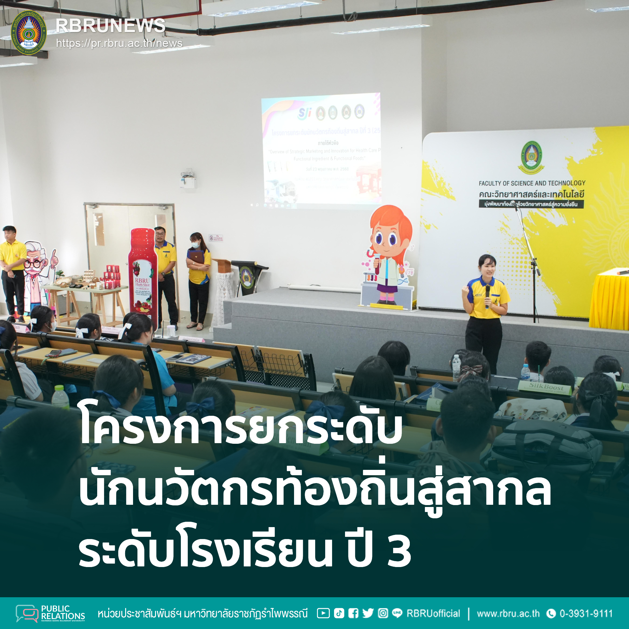 23 พฤษภาคม 2568 ที่ห้อง 40203 อาคารคณะวิทยาศาสตร์และเทคโนโลยี (อาคาร 40) ผู้ช่วยศาสตราจารย์ วิชลัดดา อุ่นสะอาด คณบดีคณะวิทยาศาสตร์และเทคโนโลยี เป็นประธานเปิดโครงการยกระดับนักนวัตกรท้องถิ่นสู่สากล ปีที่ 3 ภายใต้ธีมงาน Cosmetic Health Food Environment and Agriculture ซึ่งเป็นความร่วมมือระหว่างคณะวิทยาศาสตร์และเทคโนโลยี มหาวิทยาลัยราชภัฏรำไพพรรณี , มหาวิทยาลัยราชภัฏลำปาง , มหาวิทยาลัยราชภัฏเพชรบูรณ์ , มหาวิทยาลัยราชภัฏสุรินทร์ และบริษัทเอสแอนด์เจ อินเตอร์เนชั่นแนล เอนเตอร์ไพรส์ จำกัด (มหาชน) โดยมีเป้าหมายร่วมกันในการยกระดับนักเรียนสู่การเป็นนักนวัตกรที่สามารถสร้างสรรค์นวัตกรรมท้องถิ่น ผ่านกระบวนการทางวิทยาศาสตร์ และกระบวนการวิจัย จนสามารถสร้างสรรค์นวัตกรรมท้องถิ่นสู่มาตรฐานในระดับสากล วัตถุประสงค์ของการจัดโครงการในวันนี้ เพื่อส่งเสริมสนับสนุนให้เกิดนักนวัตกรตั้งแต่ระดับโรงเรียน และเพื่อช่วยให้นักเรียนสามารถสร้างสรรค์ผลงานนำไปสู่ต้นแบบนวัตกรรมที่สามารถต่อยอดในเชิงพานิชย์และสามารถแข่งขันในระดับสากลได้อย่างต่อเนื่อง