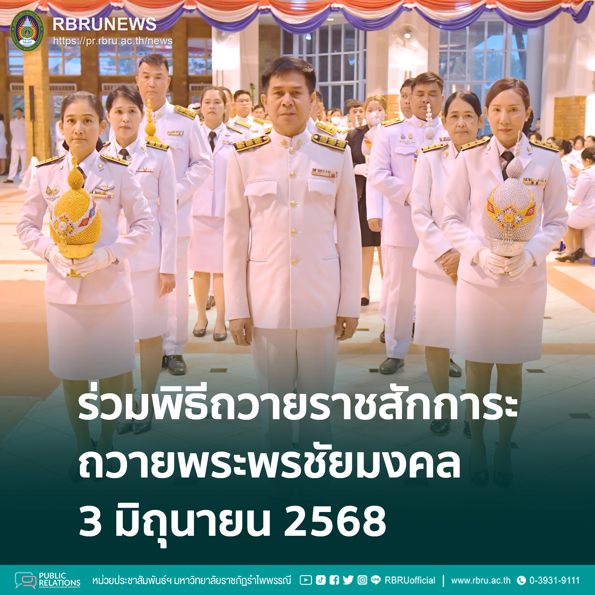 3 มิ.ย.68 ที่ศาลาเฉลิมพระเกียรติสมเด็จพระเจ้าตากสินมหาราช (ศาลากระต่าย) จังหวัดจันทบุรี ดร.ภูริพัฒน์ แก้วตาธนวัฒนา คณบดีคณะนิเทศศาสตร์ ผู้แทนผู้บริหารมหาวิทยาลัย พร้อมคณะทำงาน ร่วมพิธีถวายราชสักการะ วางพานพุ่ม และจุดเทียนถวายพระพรชัยมงคลอย่างสมพระเกียรติ เนื่องในโอกาสวันเฉลิมพระชนมพรรษาสมเด็จพระนางเจ้าสุทิดา พัชรสุธาพิมลลักษณ พระบรมราชินี โดยมีนายมนต์สิทธิ์ ไพศาลธนวัฒน์ ผู้ว่าราชการจังหวัดจันทบุรี เป็นประธานในพิธี พร้อมด้วยนางวารุณี ไพศาลธนวัฒน์ นายกเหล่ากาชาดจังหวัดจันทบุรี รองผู้ว่าราชการจังหวัด หัวหน้าส่วนราชการ ตุลาการ ทหาร ตำรวจ และประชาชนทุกหมู่เหล่าจากจังหวัดจันทบุรีเข้าร่วมพิธีด้วยความพร้อมเพรียง