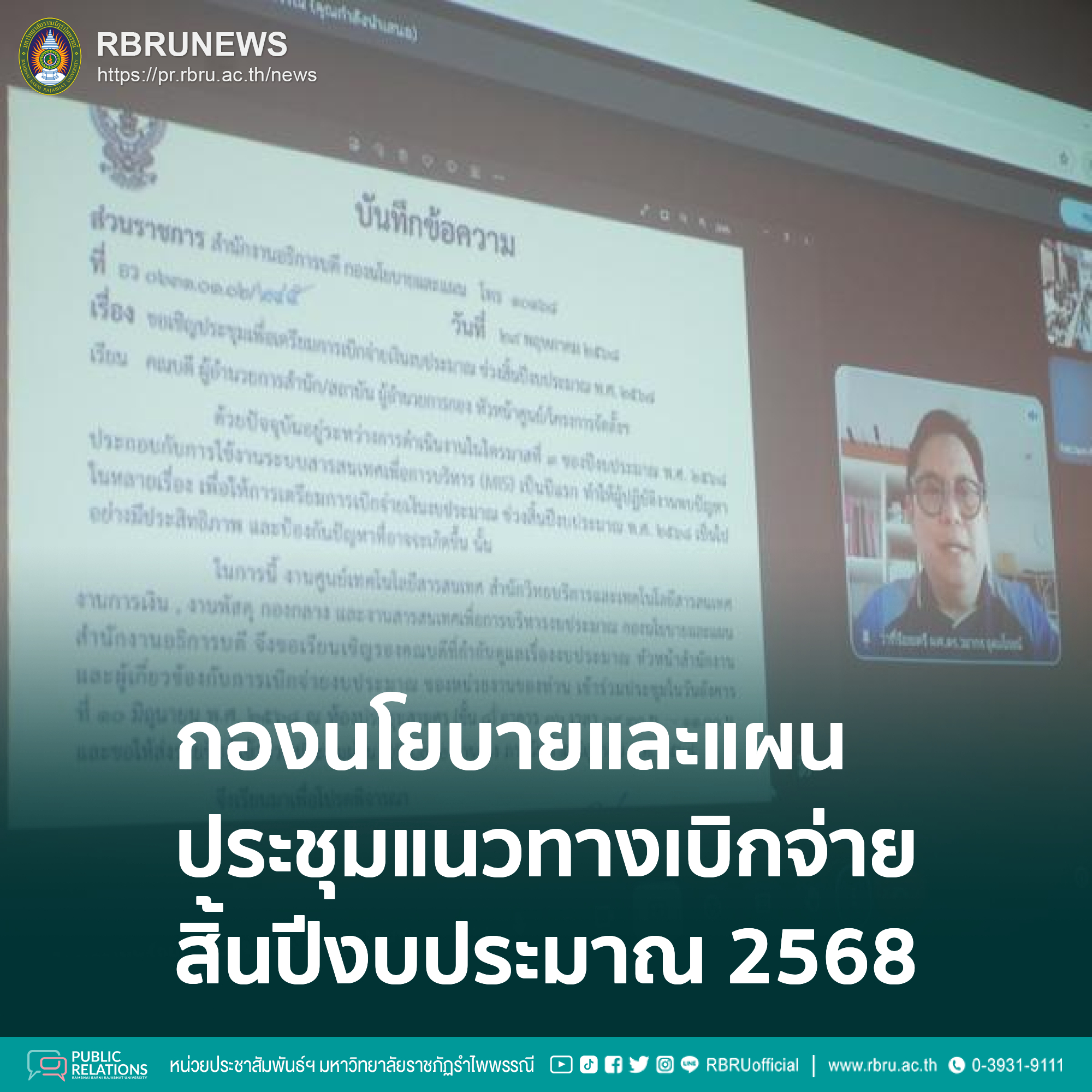 10 มิถุนายน 2568 ณ ห้องประชุมสามศร ชั้น 8 อาคาร 36 มหาวิทยาลัยราชภัฏรำไพพรรณี กองนโยบายและแผน จัดประชุม “เตรียมความพร้อมการเบิกจ่ายช่วงสิ้นปีงบประมาณ พ.ศ. 2568” โดยมีหัวหน้างานและเจ้าหน้าที่ผู้รับผิดชอบด้านการเงินและพัสดุจากหน่วยงานภายในมหาวิทยาลัยเข้าร่วมประชุมอย่างพร้อมเพรียง