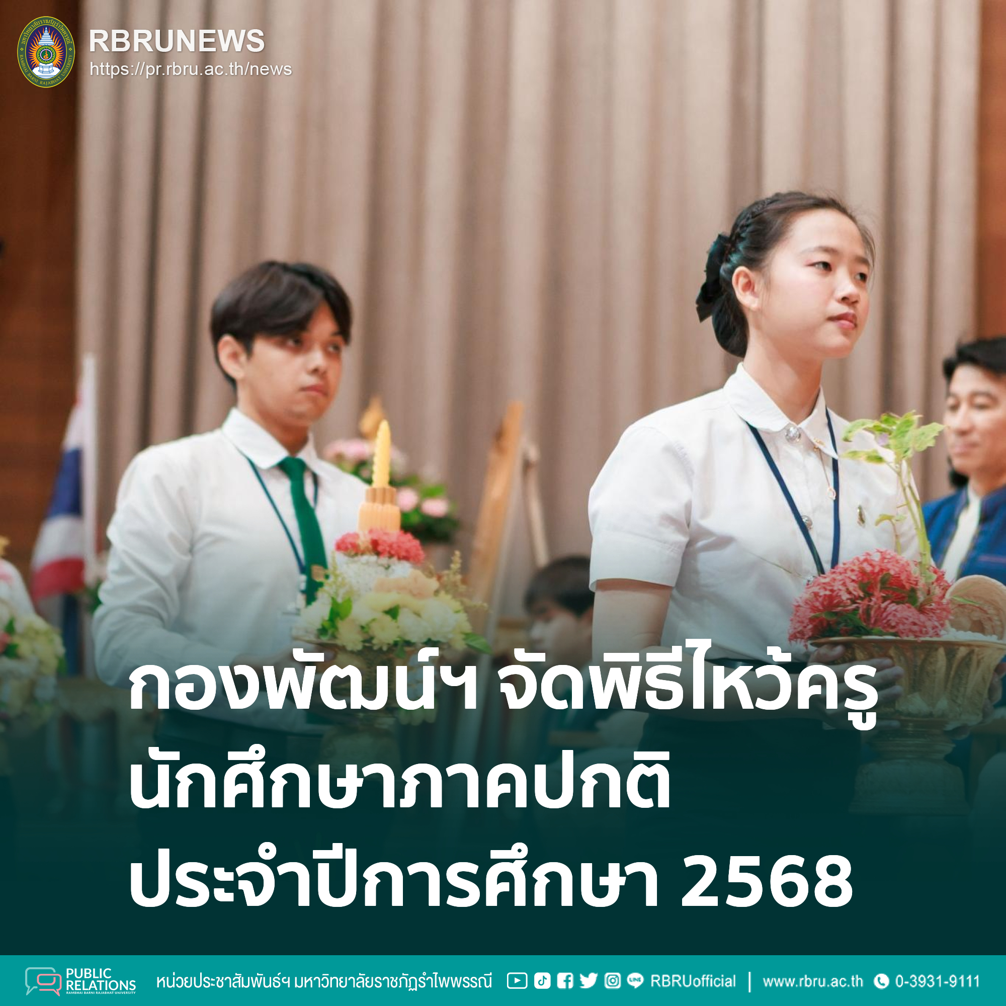 ณ หอประชุมสิริรำไพพรรณ มหาวิทยาลัยราชภัฏรำไพพรรณี ผู้ช่วยศาสตราจารย์ไวกูณฑ์ ทองอร่าม อธิการบดีมหาวิทยาลัยราชภัฏรำไพพรรณี เป็นประธานในพิธีไหว้ครูภาคปกติ ประจำปีการศึกษา 2568 ซึ่งจัดโดยกองพัฒนานักศึกษา มหาวิทยาลัยราชภัฏรำไพพรรณี โดยมีผู้บริหาร คณาจารย์และนักศึกษาทุกสาขาวิชาเข้าร่วมพิธี โดยพิธีไหว้ครูภาคปกติ ประจำปีการศึกษา 2568 เริ่มด้วยพระสงฆ์อาราธนาศีล คณะผู้บริหารถวายจตุปัจจัยไทยธรรม ประธานในพิธีการเจิมหนังสือ นักศึกษาทุกสาขาวิชาถวายพานไหว้ครู จากนั้นเป็นการมอบทุนการศึกษาจากมูลนิธิกองทุนการศึกษาต่าง ๆ และผู้บริจาคทันการศึกษา ต่อด้วยการประกาศผลรางวัลการประกวดพานไหว้ครู