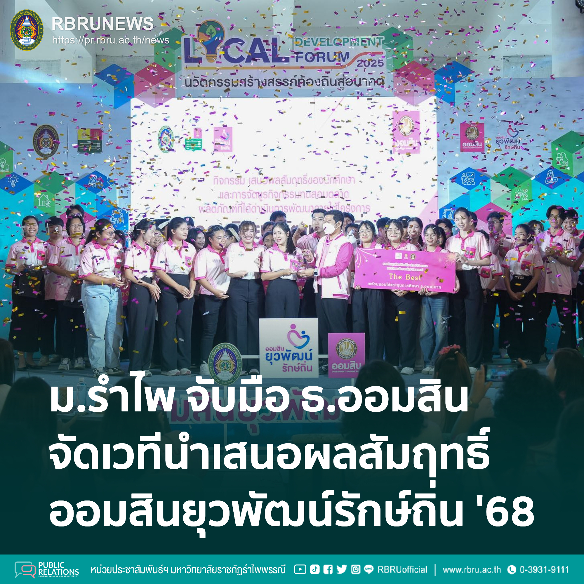 เมื่อวันที่ 29 สิงหาคม พ.ศ. 2568 ณ ลานอเนกประสงค์ ชั้น 1 อาคาร 36 มหาวิทยาลัยราชภัฏรำไพพรรณี ผู้ช่วยศาสตราจารย์ ดร.วยากร อุดมโภชน์ รองอธิการบดี ด้านวางแผนและพัฒนา ให้เกียรติเป็นประธานในพิธีเปิดเวทีนำเสนอผลการดำเนินโครงการออมสินยุวพัฒน์รักษ์ถิ่น 2568 ซึ่งดำเนินงานอย่างต่อเนื่องเป็นปีที่ 6 ด้วยความมุ่งมั่นที่จะเป็นกลไกสำคัญในการพัฒนาชุมชนท้องถิ่นอย่างยั่งยืน
