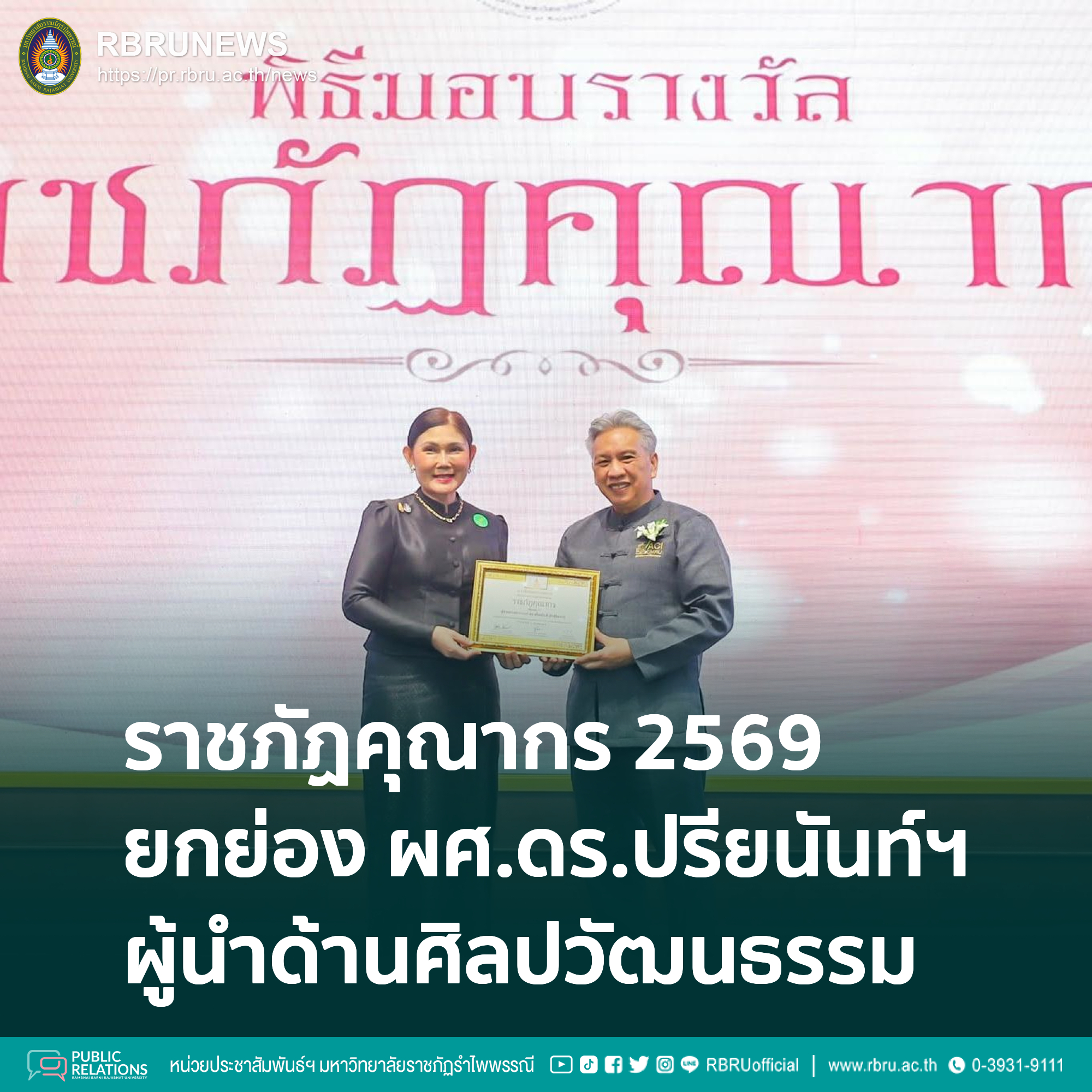 ผศ.ดร.ปรียนันท์ สิทธิจินดาร์ รองอธิการบดีด้านกิจการพิเศษ มหาวิทยาลัยราชภัฏรำไพพรรณี ได้รับรางวัลอันทรงเกียรติ "ราชภัฏคุณากร" ประจำปี 2569 จากสภาศิลปะและวัฒนธรรม มหาวิทยาลัยราชภัฏแห่งประเทศไทย ในการประชุมสามัญประจำปีฯ ครั้งที่ 5 ณ จังหวัดเชียงใหม่ รางวัลนี้มอบให้กับบุคลากรผู้มีผลงานโดดเด่นด้านการทำนุบำรุงศิลปะและวัฒนธรรม จากมหาวิทยาลัยราชภัฏทั้ง 38 แห่งทั่วประเทศ